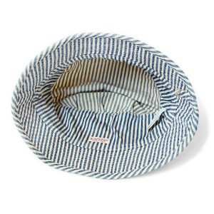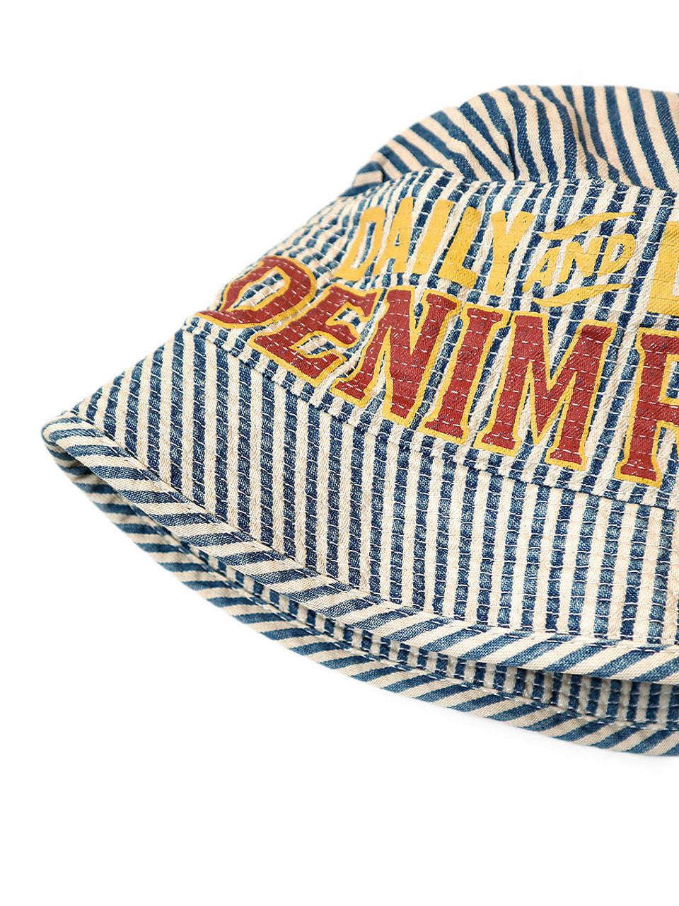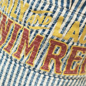 A hat with a vintage-like logo printed on it. Different designs are printed on the front and back of the crown. The top part has a bulging shape with tucks. Made of hickory denim, it has been distressed. *This product uses IDG dyes. When worn, the color may transfer to other clothing. *This product has been treated to