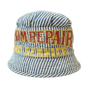 A hat with a vintage-like logo printed on it. Different designs are printed on the front and back of the crown. The top part has a bulging shape with tucks. Made of hickory denim, it has been distressed. *This product uses IDG dyes. When worn, the color may transfer to other clothing. *This product has been treated to