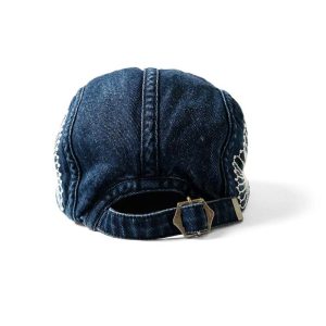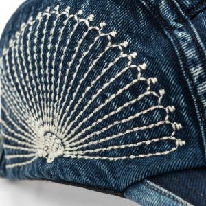 This 5-panel cap from KAPITAL is crafted from indigo-on-indigo denim and features contrast sashiko-style embroidery inspired by traditional furoshiki wrapping cloths. The washed finish gives it a broken-in look, while the soft crown and curved brim offer an easy fit. Designed for daily wear, it adds a textural accent w
