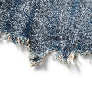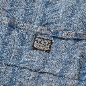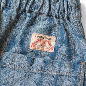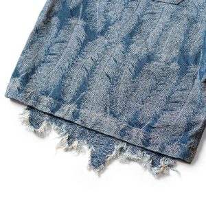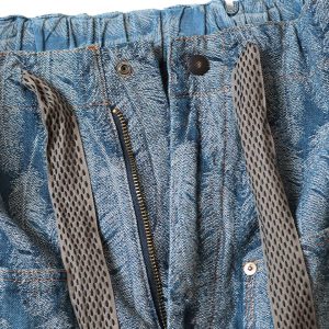 Shorts with a double knee design made of 12oz denim. Jacquard denim is used to express the beautiful blue feathers of the magpie in three dimensions. The waist is easy to wear with elastic and string. The ends of the double knee patch are cut off to express the light atmosphere of the feathers. * Indigo (dark color) an