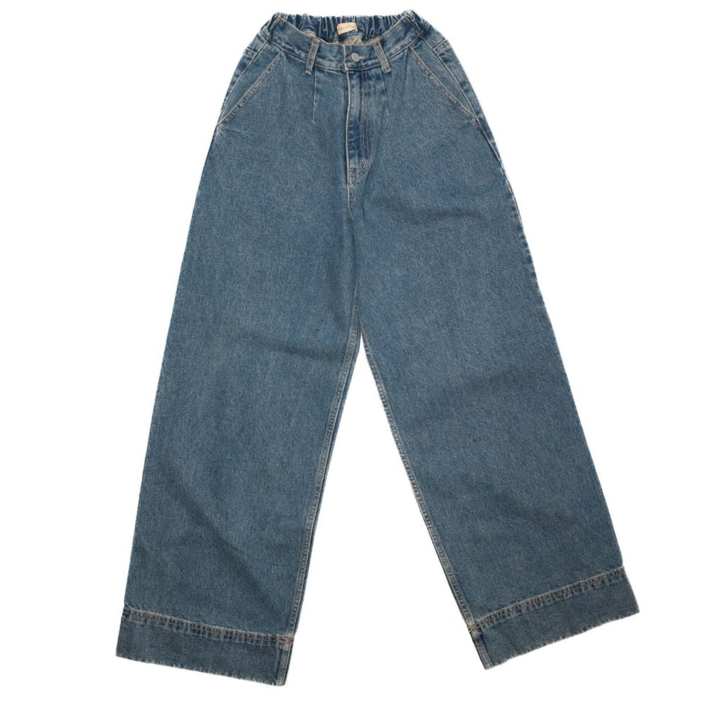Estudio Niksen's Big Hem Denim Jeans feature a larger hem for styling. Embroidered logo at back pocket and custom trimmings. Elastic band at back. Wide fit. Big Hem Denim Jeans Blue 100% Cotton Made In Seoul SS25-6002-255 Size Chart: Waist: Size 1 – 10in to 15in (US28 up to US30 approx.) / Size 2 – 11.5in to 17in (US