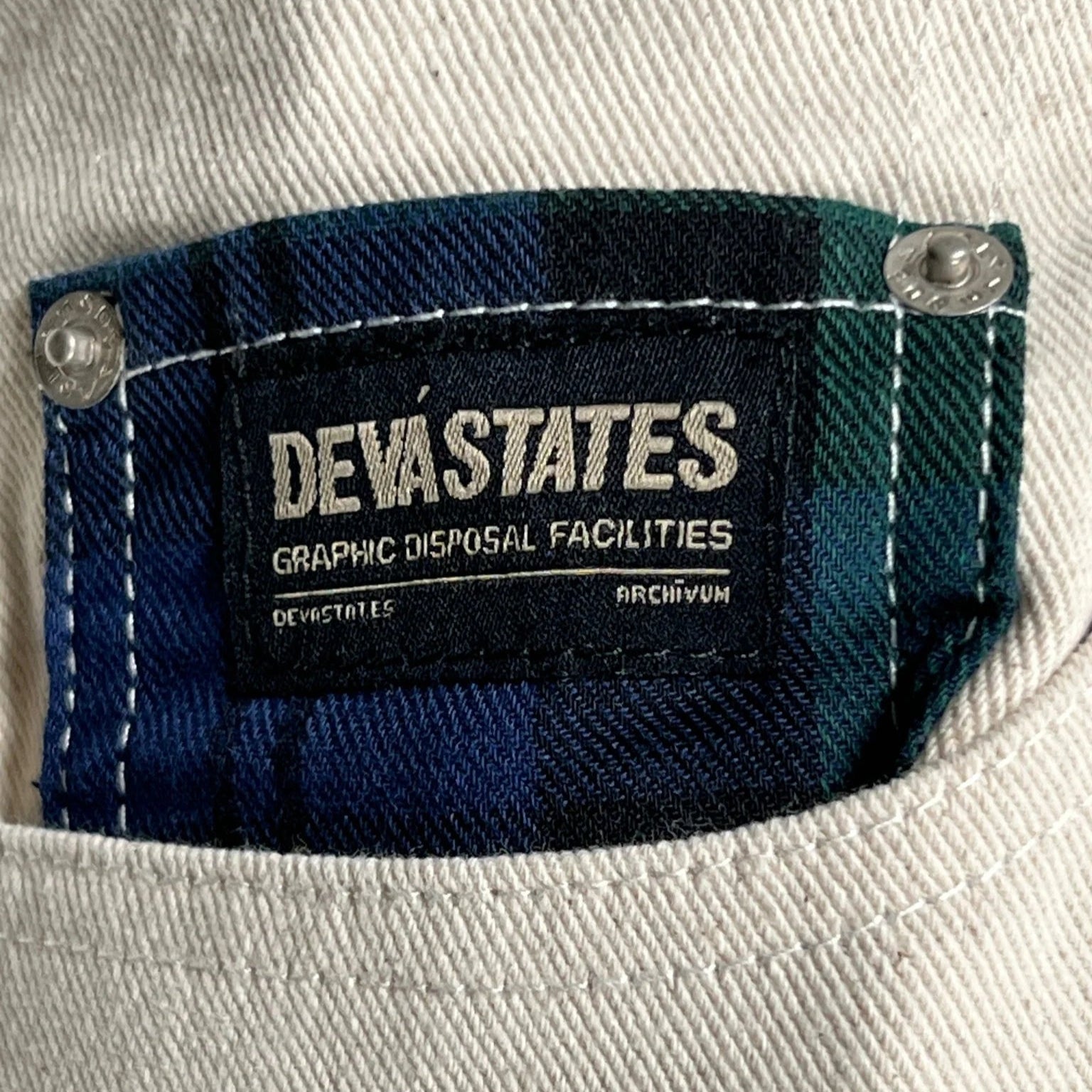 100% cotton denim Regular fit Straight leg Five pockets styling Button fly Screen printed spider web details on pockets Signature Devá branded buttons Made in Indonesia DSD7WOW202S25