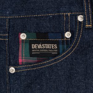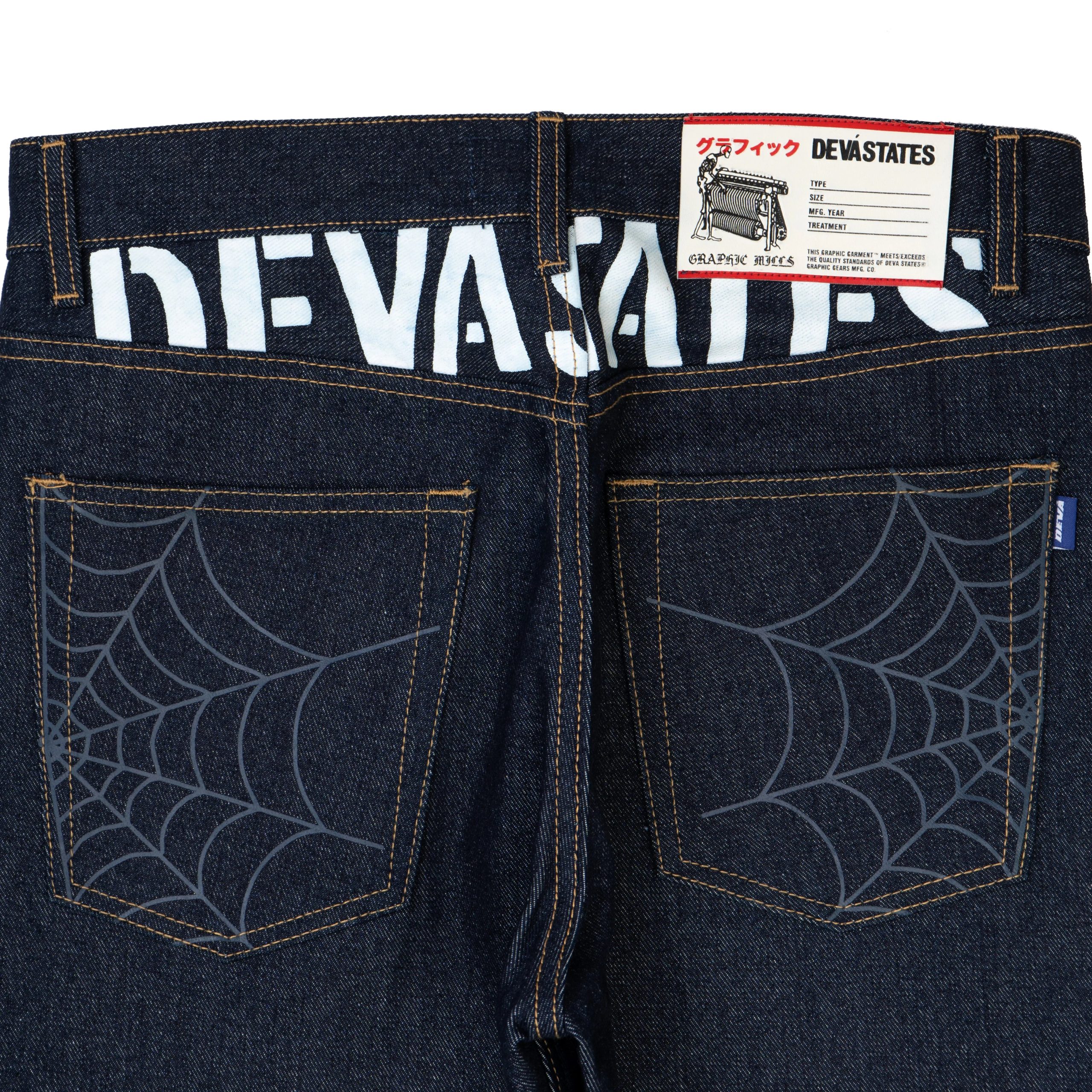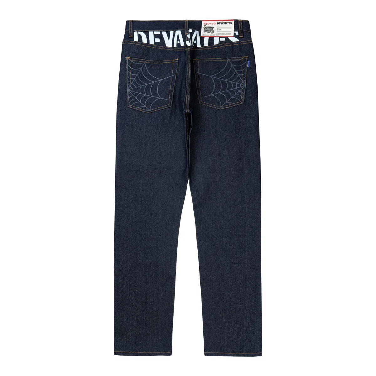 100% cotton denim Regular fit Straight leg Five pockets styling Button fly Screen printed spider web details on pockets Signature Devá branded buttons Made in Indonesia DSD7BL201S25