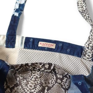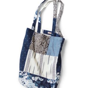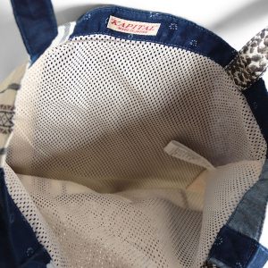 A patchwork tote bag made with fabrics of various patterns. Mesh fabric is used for the lining. *This product uses natural materials. Since we value the characteristics and unique texture of the material, there may be some variation in the appearance and size. *IDG dye is used for the indigo color. The color may transf