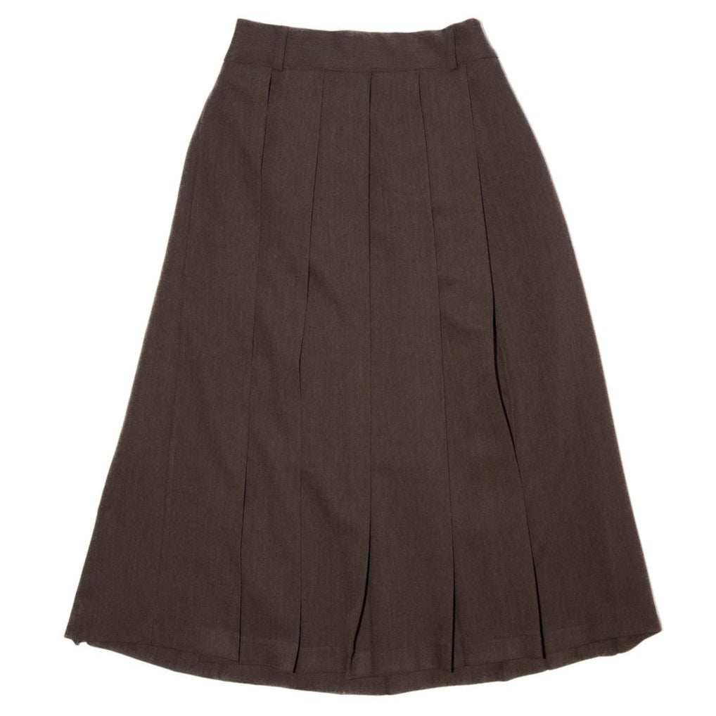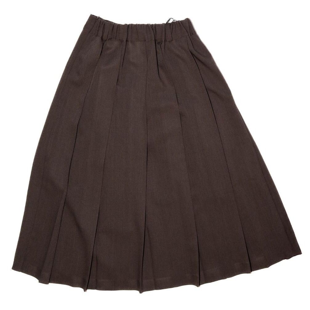 Estudio Niksen's Pleated Wide Skirt features front and back pleats. Mid-weight fabric. Elastic band at back. Mid-length underskirt. Zipper closure on one side. Pleated Wide Skirt Brown 95% Polyester / 5% Spandex Made in Seoul SS25-5011-200 Sizing Chart: Waist: Size 1 12in up to 16in // US26 up to US32 approx. – Size 2