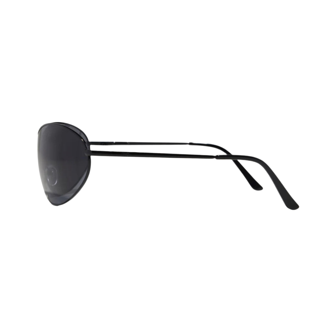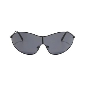Meet Ruse, a 2000s inspired metal shield sunglass that's nostalgic but hyper current at the same time. With a single piece wrap lens and rimless frame, this oversized, polished black sunglass is perfect for a night out or the morning after. Hypo-allergenic metal alloy Eye size 79mm Bridge width 18mm Temple length 125mm